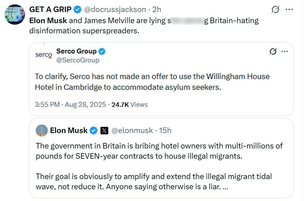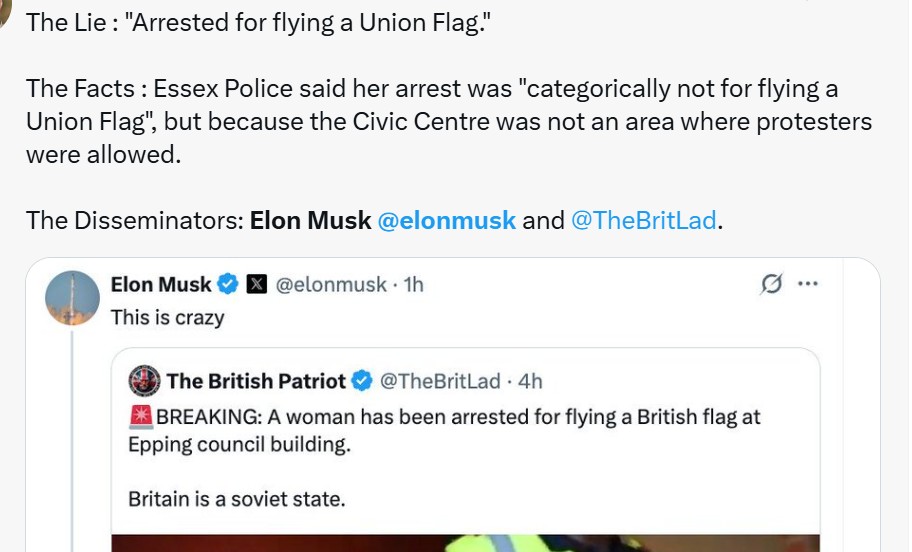 Saw this video on Twitter. Utterly disgusting treatment of this nurse. People are being stirred up to hate by Reform, by Tommy Robinson and the like. Elon Musk absolutely amplifies this on Twitter. He shiit-stirs the migrant issue repeatedly by spreading lies and misinformation. They want people to hate, they want protests to descend into violence. To harm the UK and its people. Farage wanting us to come out of the ECHR, to repeal the Human Rights Act and these racist fools fall for his nonsense not realising that all that will do is harm them. It's terrifying. Example of just one of Musk's campaign of disinformation: Musk-lies-...nsored.jpg