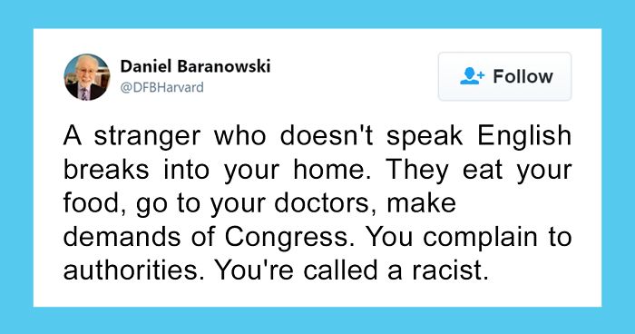 Load More Replies...The problem is that Americans are not complaining about ALL immigrants, only the non-white ones. His great grandad was a white EUROPEAN immigrant, so that's ok. But if the immigrant is/was from any non-white origin, then you complain...