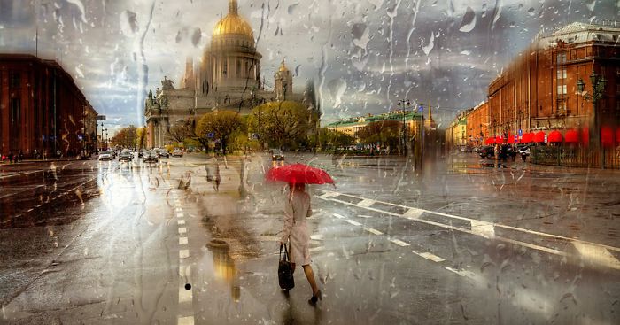 St. Petersburg-based Russian photographer Eduard Gordeev captures delicate cityscape scenes by taking photos in the rain. Flowing rain drops blur the colors and diffuse light, resulting in photos that have a strong resemblance to Impressionist oil paintings.