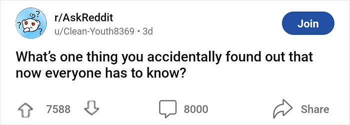 A few days ago, Reddit user Clean-Youth8369 asked everyone else on the platform, "What's one thing you accidentally found out that now everyone has to know?" and has received over 8,000 replies.