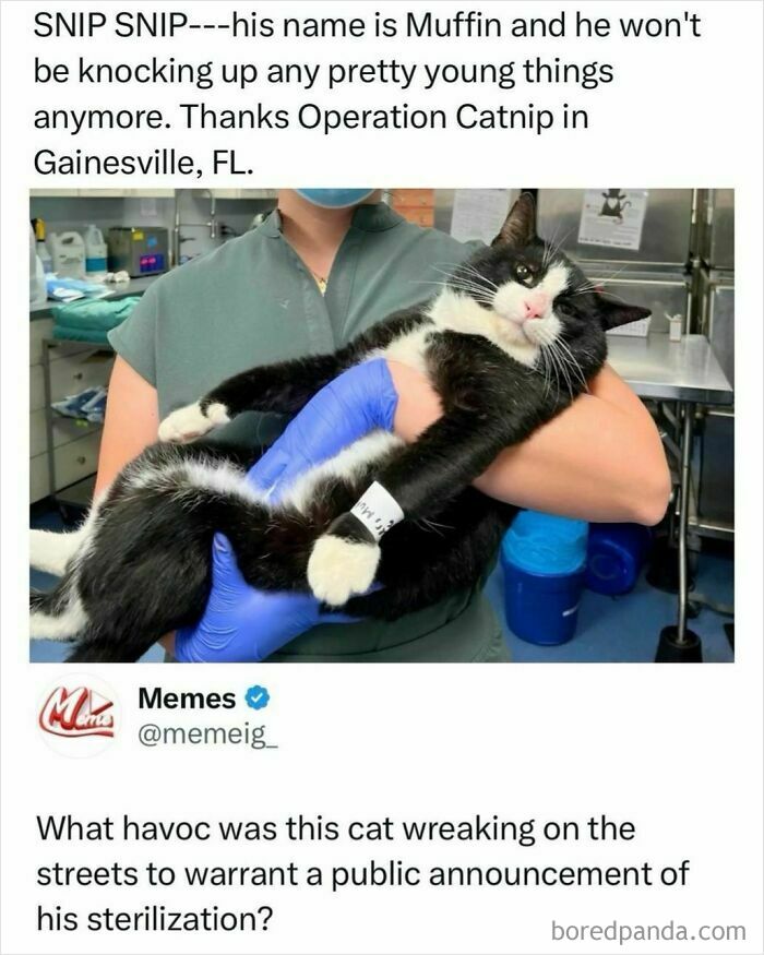It's not for the street, it's for all the cat people in the area, knowing their little girls are not going to be Mamas anytime soon. Will you look at the smile on Muffin's face? He's definitely already drugged, because no male would look like that if they knew they were on their way to be neutered.