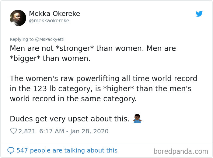 I’m not saying there aren’t extremely strong women out there and good for them, but this post is nonsensical. So one woman in one weight class is stronger than the strongest man in that same weight class. IN ONE CLASS. The strongest men in the world generally weigh 300-400 pounds. By the poster’s logic if a woman got to that size she’d be as strong or stronger. It’s simply not correct and it’s not sexist to say so...