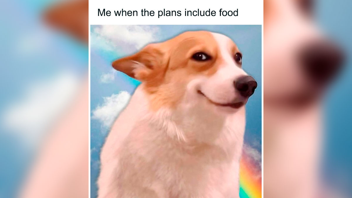 Smiling corgi meme with text about food plans, a funny image helping you decompress and relieve stress.