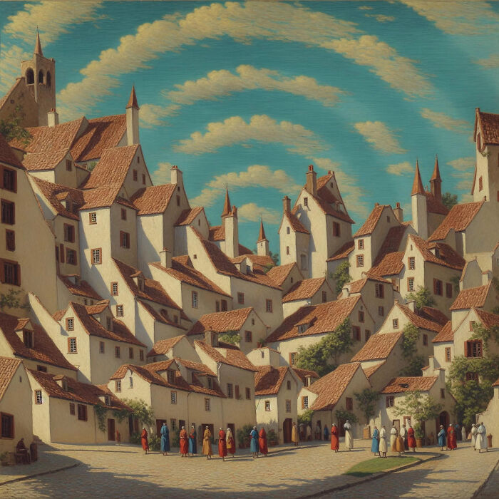 Whimsical village scene with tall, surreal houses and people in colorful attire.