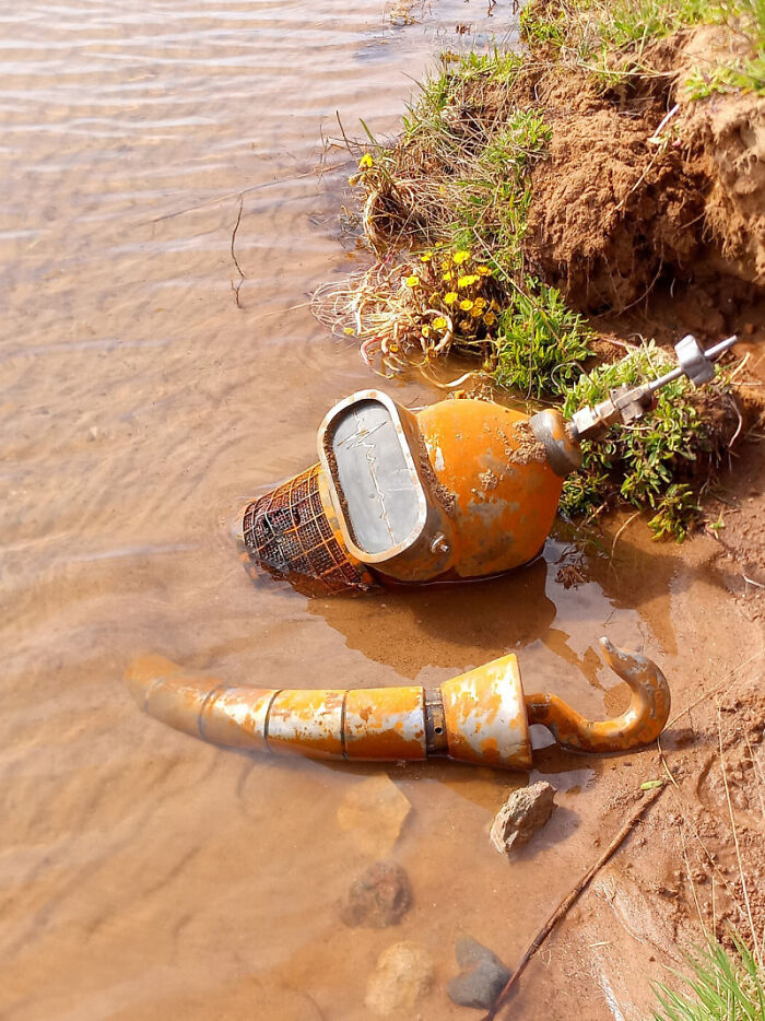 Rusty industrial equipment partly submerged in water, evoking a 'hmmm' reaction with its unusual placement and weathered appearance.