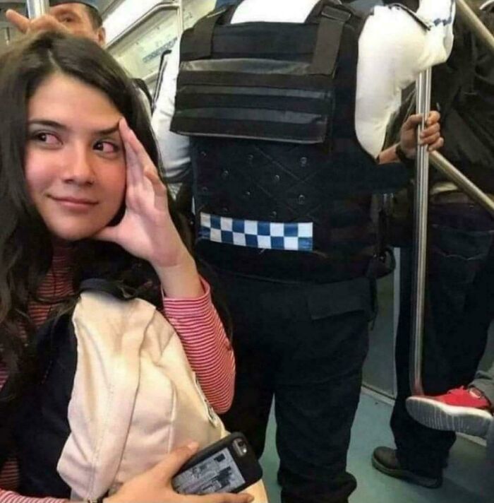 Woman on subway looking intrigued, holding phone, next to person in uniform; moment capturing a 'hmmm' reaction.