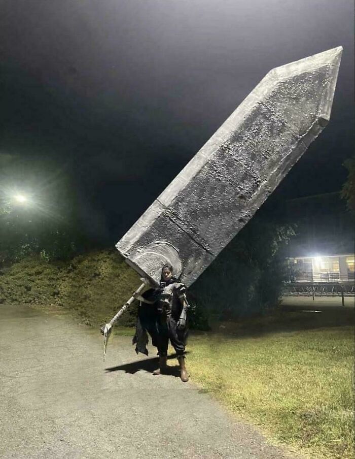 A person dressed in a costume holds an enormous sword at night, evoking curiosity.