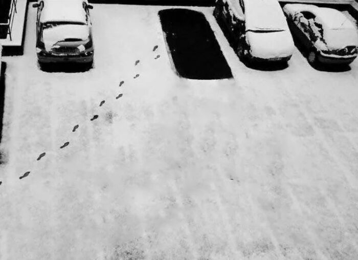 Footprints in snow leading to parked cars, creating a curious and intriguing scene.