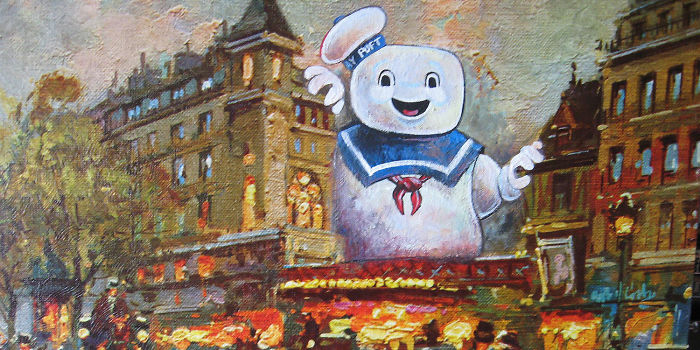 Some of the characters that Irvine (behind the “Gnarled Branch” website and store) has added to his “Re-Directed Paintings” seem to clash with and invade their surroundings, but others seem to fit right in. Impressively, he works in a variety of media, and does a great job of copying the original artist’s style in almost every painting he “visits.”