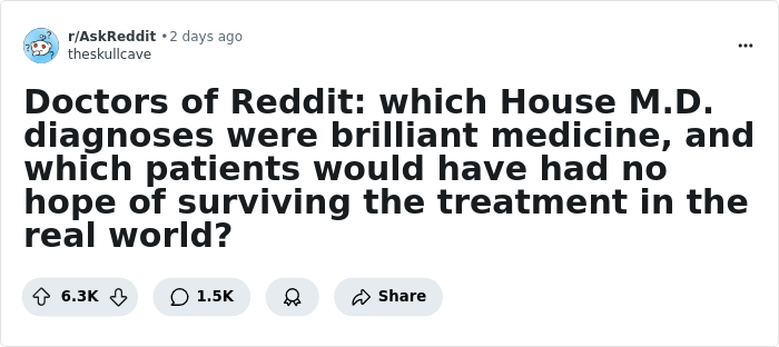 Load More Replies...As someone with a chronic illness that took from 1998-2011 to be diagnosed. Most people with chronic conditions WISH for someone like House. I've met doctors who seem to think they need to act like him, but without his brains.