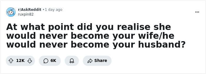 That brings us to today’s topic. On November 27, 2024, one Reddit user asked, “At what point did you realize she would never become your wife/he would never become your husband?” on r/AskReddit. And, oh boy, people had a lot to say.