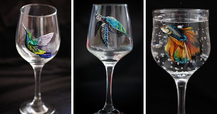 I love painting on glass instead of canvas because it gives a unique result and it can transform any object into an artwork that you can actually use. You can be drinking a nice glass of wine while admiring a beautiful painting in your hand.