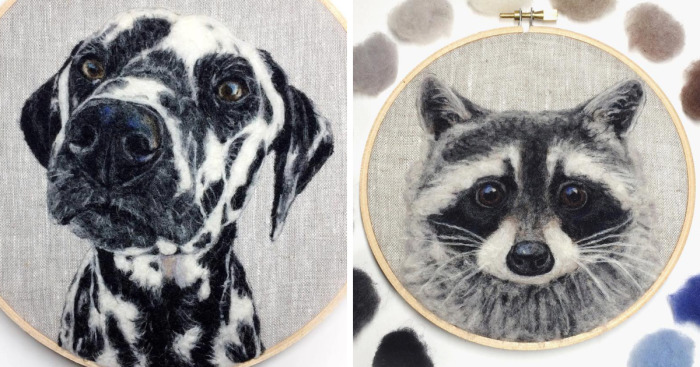 The portraits made by the artist Dani Ives seem to carry several brush strokes of ink but are incredibly produced only with wool and needle.