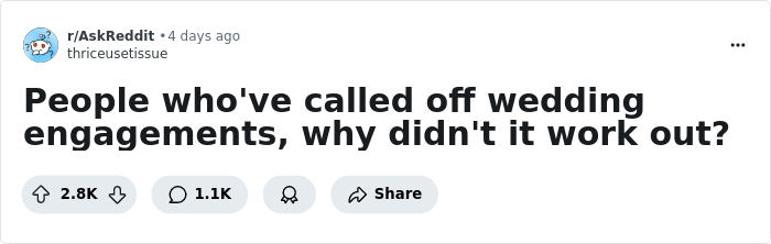 That was the case for these Redditors, who chose to call off their engagements before making it to the altar.