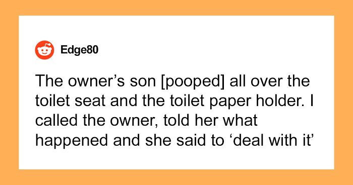 Worked for a privately owned bakery for exactly 1 week. The owners son comes in, walks passed the counter and into the bathroom. He comes out a few minutes later without acknowledging me or my coworker, gets into his car and drives away. We both looked at each other then opened the door only to find this guy literally s**t all over the toilet seat and the toilet paper holder. I called the owner, told her what happened and she said to “Deal with it.” So I asked my coworker if she wanted to clean it up because I wasn’t going to. She declined and I told her I was walking out. She did as well. We locked up the store and told the owner we quit but would reconsider staying if her son came back to clean up his own mess. She yelled and berated us for 20 seconds before I said goodbye and hung up.