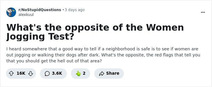 It's been said that if you see women jogging in a neighborhood after dark, there's a high chance that it is a safe place. It's not a hard-and-fast rule, but rather a rough indicator of the level of safety in a particular area.
