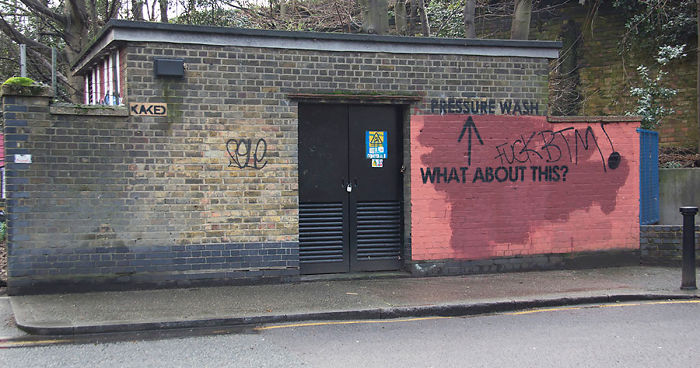 “I cycled past this street of London on the way to work for years,” he writes on his website. “I noticed that graffiti stencil painted within the red area was ‘buffed’ with red paint. However, graffiti outside of the red area would be removed via pressure washing. This prompted the start of an experiment, or, if you like, an act of vandalism. Unlike other works, I was very uncertain as to what results it would yield. Below is what transpired over the course of a year.”