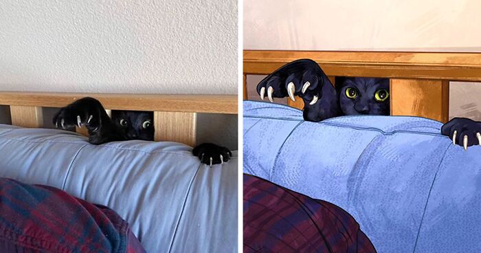 Besides bringing our attention to hilarious cat images shared online, Emily transforms them into vibrant, captivating digital paintings. Previously, Emily shared how it all began: “The project started when I decided to draw a cat every day until I was able to adopt one myself. For a while, I imagined I might be drawing cats forever, doomed to never adopt one. Magically, things fell into place, and on day 21, my family and I adopted Beanie, a two-month-old rescue kitten.”