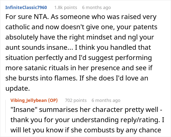 Load More Replies...I am a Christian and I 100% support this amazing gal! I am heavily educated in both theology and psychology. Logged training hours and college classes, even. That aunt is a f***ing psycho (vernacular, I hope...). Also, I'm mischievous enough that even Loki would be wary and this teen is a bad***! PS Christians who pull this s*** are on my top tier of WTF IS WRONG WITH YOU?!?! list.