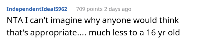 In the teen’s mind, it may seem that she caused trouble and that she ruined a relationship, especially when the woman’s family blames her, but for redditors, it was clear as day that the teen did the right thing and actually, they admired the dad too for discussing such matters as marrying a new woman with his daughter first.
