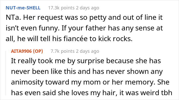 Load More Replies...Hmm - strange how the girlfriend had no animosity to the OP's mother's memory, or to OP's hair.... until she got a ring on her finger and became "fiancée". Weird...... NOT. Biting her tongue and biding her time until she figured she had herself set, then she let her true colors show.