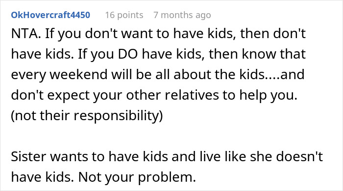 But is the OP really selfish in this story? Let’s be honest – helping out once in a while? Sure, that’s sweet. But being expected to regularly care for 3 kids? That’s not a favor, that’s a job. There’s this weird myth that people who don’t have kids are just floating through life with nothing but free time and money. Must be nice, right? Except… that’s not how it works.