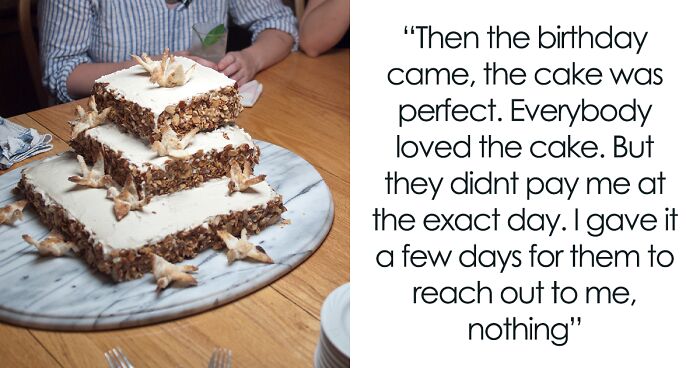 OP said she isn’t a confrontational person so she just let it go, but mentioned that she wouldn’t forget this. Four months passed and Janice texted OP again, this time asking for a cake for her birthday. She refused, as they didn’t pay last time.