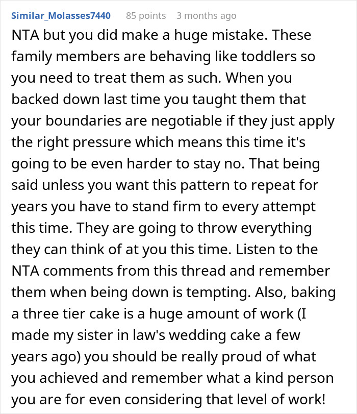 OP’s story is a good example of crossed boundaries in a familial relationship: begging her to make the cake, shaming her in chats with omitted information, and refusing to compensate her for her work are just a few.