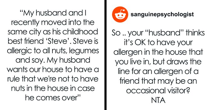 Load More Replies...If OP knows how to keep their food safe from cross-contamination in a house where people use th Op's allergen, then they know how to teach their husband how (husband's freakout makes it pretty clear he does not play an active role in helping prevent cross-contamination of OP's foods.) to keep Steve safe while at their house, without OP needing to starve for the lack of their own preferred food choices.