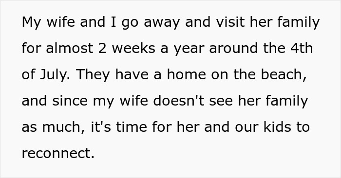 They’ve helped with the kids, offered emotional support, and even forked over money to help the OP’s mom and sister stay afloat. Basically, they’ve been the family superheroes. But even superheroes need a break, right? That’s where their annual 4th of July beach trip comes into play. The OP and his wife always visit her side of the family for two glorious weeks of sun and sand at their family beach house.