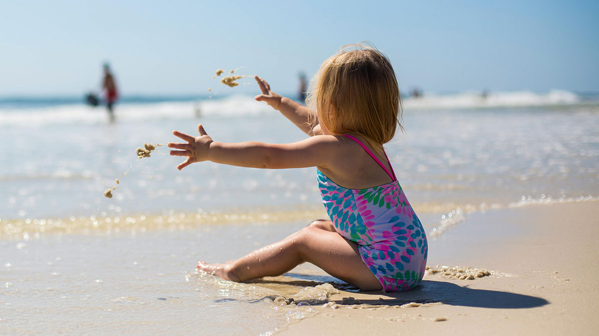 Child playing in the sand on a beach, illustrating a beach vacay with kids and family dynamics.