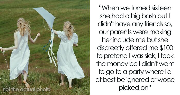 It got to the point when the girls turned 16, the OP’s sister had a big bash, and the author herself didn’t have any friends, so she wasn’t going to throw a party. Moreover, when her parents insisted that the OP’s sister invite her, she secretly offered $100 to say she was sick. The OP recalls that she then took the money – she herself did not want to go when she’d at best be ignored, or worse, picked on.
