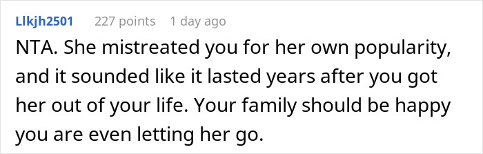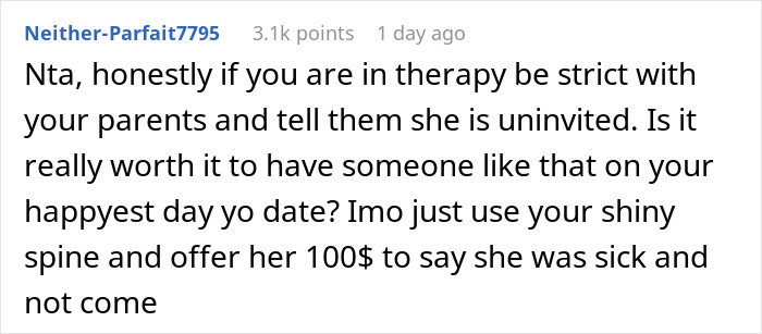 The commenters are also surprised that the parents are forcing their opinion and role on the OP for the twin, even though she sent her an invitation anyway. According to people, the sister is now simply trying to manipulate the opinions of both the author and their parents. “Family is a privilege, not a right,” the commenters note. Well, someone even suggested that the OP promise her twin a hundred dollars for not attending the wedding ceremony…