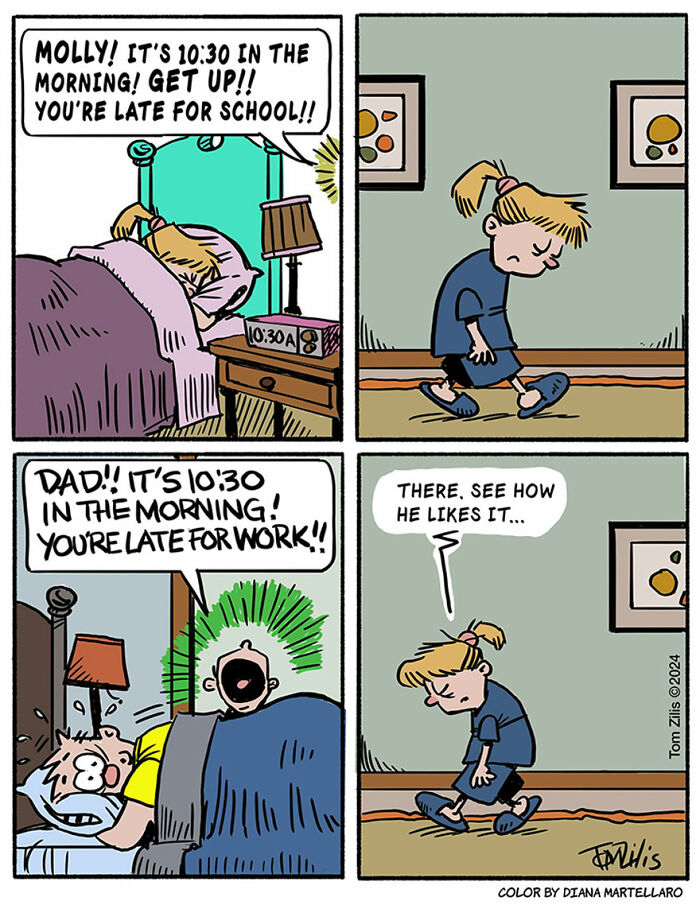 When asked about his personal favorite storyline among his comics, one that he particularly enjoyed creating, Zilis responded: “The comics I create that I really enjoy either make a point in a humorous way or how the joke is constructed. One of the recent comics I created that I thought was constructed well took place at a funeral and how the deceased died. Dark humor, but I liked the challenge of writing and editing the setup and final punchline to fit the four-frame format.”