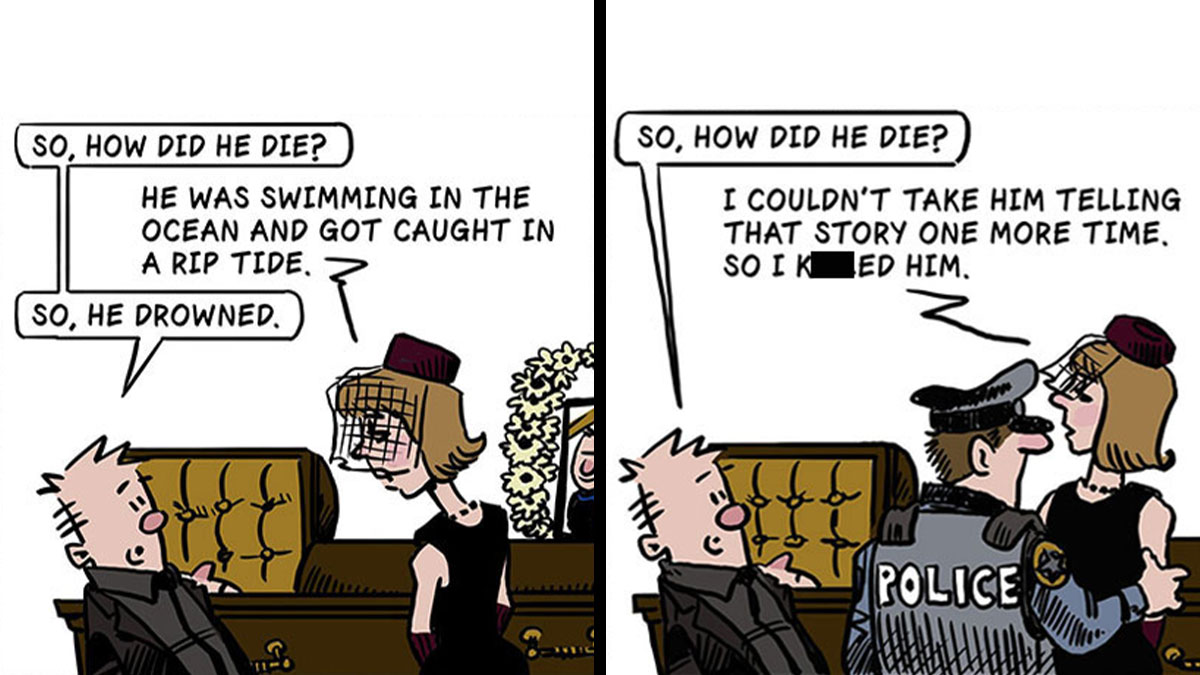 When asked about his personal favorite storyline among his comics, one that he particularly enjoyed creating, Zilis responded: “The comics I create that I really enjoy either make a point in a humorous way or how the joke is constructed. One of the recent comics I created that I thought was constructed well took place at a funeral and how the deceased died. Dark humor, but I liked the challenge of writing and editing the setup and final punchline to fit the four-frame format.”