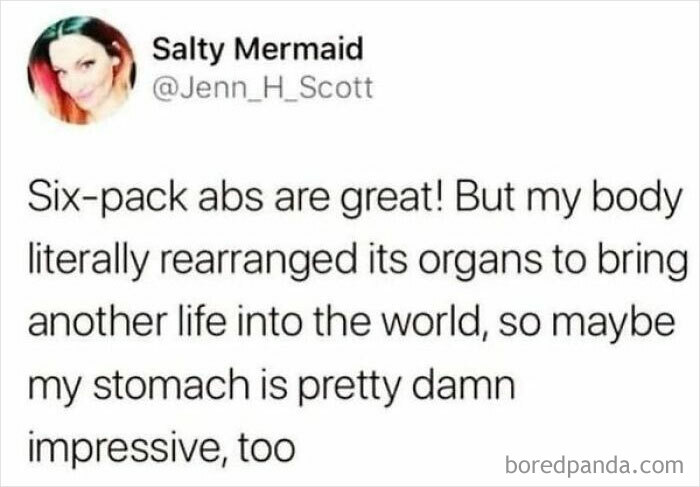 I love this comment. I had my first baby at 17. My belly was covered in bright red stretch marks when I reached my 7th month. For years after I felt sick looking at my faded scars. I would hide them and sometimes even cry. Fast forward to 45 years old. I now have 2 grown sons and a toddler girl which was a huge surprise. I look at my body now and think,wow. I have grown 3 babies. How amazing is that. I couldn't care less how my tummy looks now. Just wish I could of spoken to the younger me. I still wouldn't show my belly. But I am no longer ashamed of what it looks like
