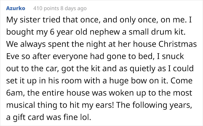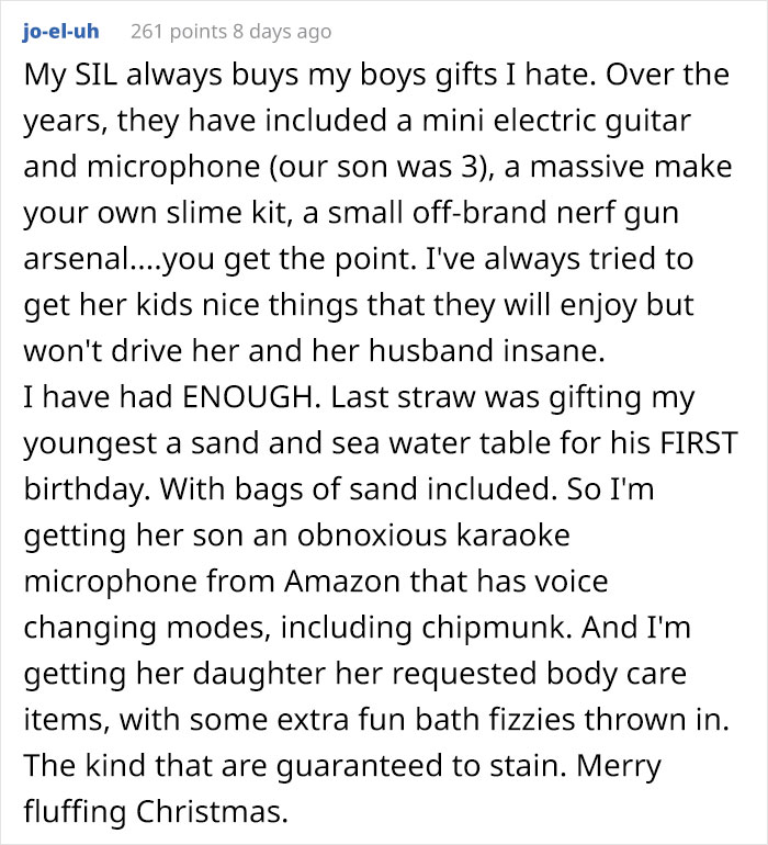 Redditor u/rustybathtub brought a smile to people’s faces after they shared his cunning plan for Christmas this year. You see, their brothers and sisters “basically ordered” him and his wife to buy their nieces and nephews expensive gifts because they believe they’re very well off. The couple thought it was unfair that they were treated this way just because they’re financially responsible, so they came up with the messiest, most fun way to get their revenge on their entitled relatives.