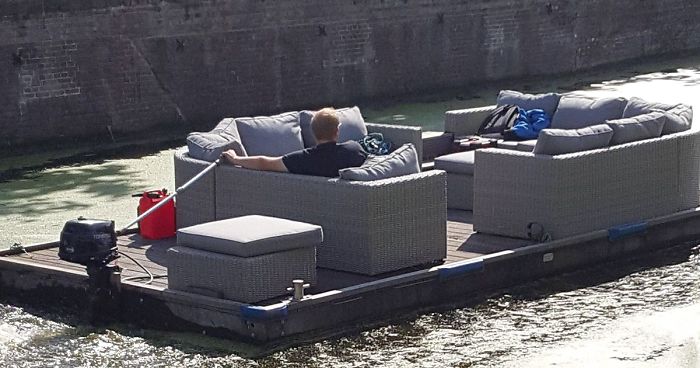 Some boats are for war, some for fishing, but this one was definitely built for chilling! This guy was spotted cruising down a canal in Groningen, the Netherlands and he seems to be having the most comfortable boat ride.