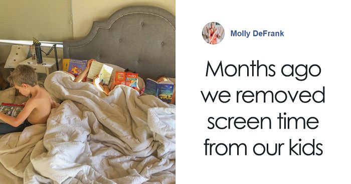 Mother, writer, and blogger Molly DeFrank found out firsthand that limiting the time her kids spend glued to phone, TV, and computer screens has plenty of upsides. She posted an honest, wholesome, and unstaged photo of her family reading books in bed one Saturday morning. It’s so heartwarming that we couldn’t help but smile.