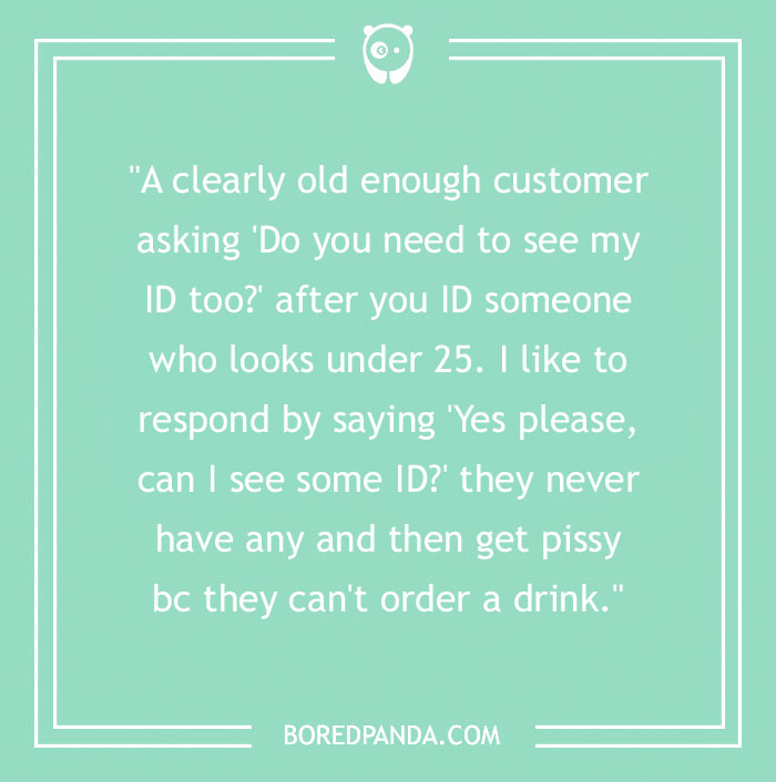 "A clearly old enough customer asking 'Do you need to see my ID too?' after you ID someone who looks under 25. I like to respond by saying 'Yes please, can I see some ID?' they never have any and then get pissy bc they can't order a drink."
