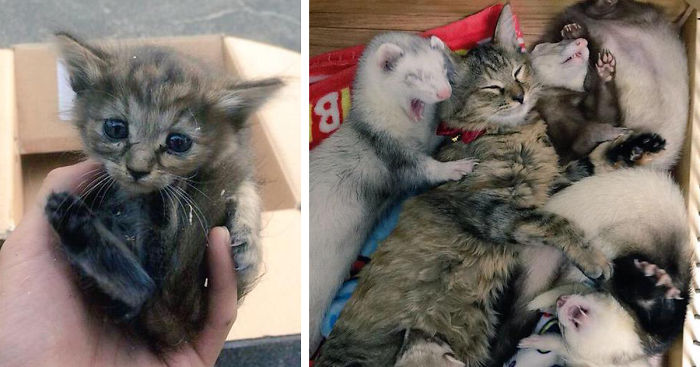 Load More Replies...They are adorable! Ferrets and cats have similar nutrition, so it's not hard to make them good friends when they eat and sleep together.