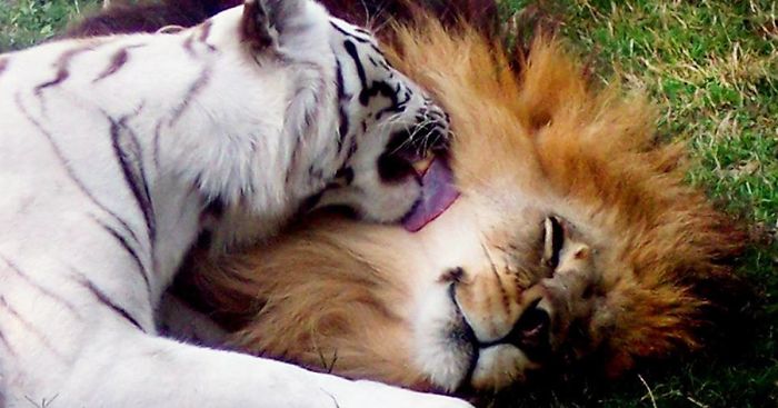 Life wasn’t always easy for this lion named Cameron and his white tigress Zabu. They were bred at a zoo in New England back in 2000 for one purpose only – to make ligers. Zabu, a Siberian-Bengal hybrid, had genetic flaws due to breeding and Cameron was 200 pounds underweight. Luckily, in 2004 they were both rescued from the zoo.