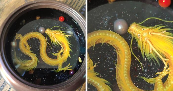 Artist Feif Dong has mastered the beautiful art of painting on resin. The artist creates intricate and detailed works of fish, dragons, and many other things. They use things like seashells, bowls, plates, and wood as their canvas. Which makes each piece unique and unlike any other.