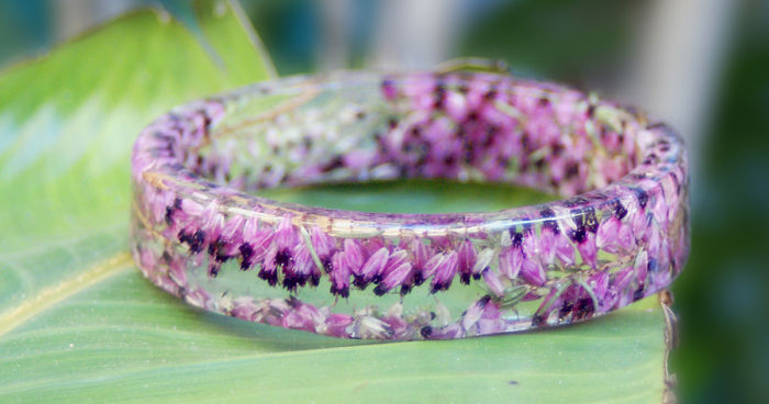 She writes that it can take her 2-3 weeks to complete a single piece of her unique jewelry – “from design to pouring resin, curing, to shaping the piece.“ Fortunately, she does take custom orders and can create bracelets or bangles from plants or other decorative elements sent in by clients as well.