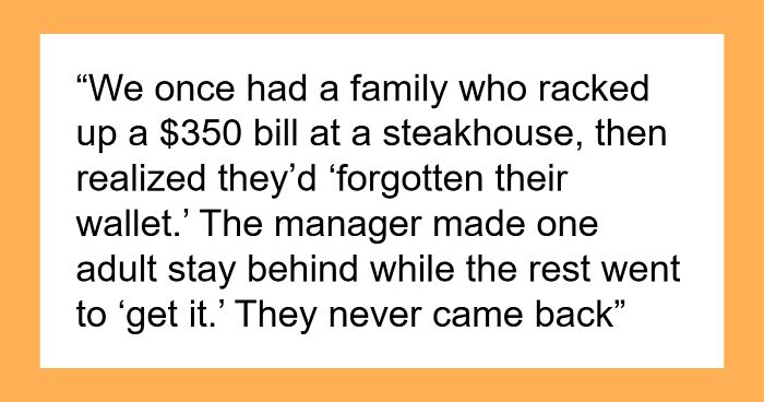 We once had a family who racked up a $350 bill at a steakhouse, then realized they’d “forgotten their wallet.” The manager made one adult stay behind while the rest went to “get it.” They never came back. The guy sat there for three hours before admitting they ditched him too 💀.