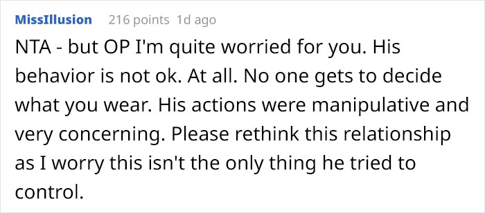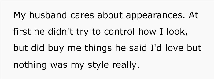 The thing is, the woman’s husband deeply cares about appearance; at first, he didn’t try to control the OP’s looks but still bought her clothes that he vouched she’d love, though the author mentioned that nothing was ever in her style.