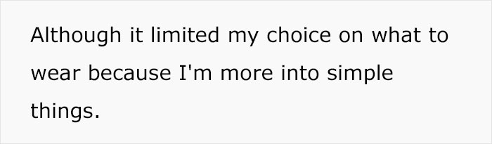 The spouse also introduced the OP to high-end brands and she began wearing the clothes whenever there was an occasion involving her husband’s loved ones, though the woman mentioned that it did limit her choices on what to wear, as she’s more into simple things.
