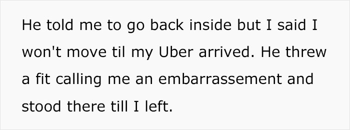 The man followed his wife outside where they began arguing; he said that he couldn’t understand why the OP was behaving like this and embarrassing them both in front of his friends. The author revealed that it seemed like he looked down on her dress and tried to trick her into wearing something that he wanted by spilling wine all over her. He threw a fit and told her to go back inside – however, the woman refused and said that she wouldn’t move until her cab arrived.