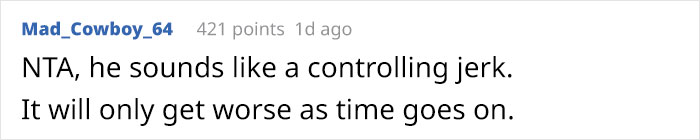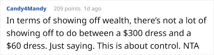 Naturally, the guy wasn’t so pumped about it and even said that the author was violating the “rules” that they’d discussed days after they got married. The OP revealed that the purchased dress wasn’t in her style and said that she could either wear her $60 dress or she wasn’t going to the event.