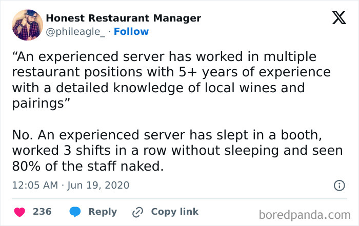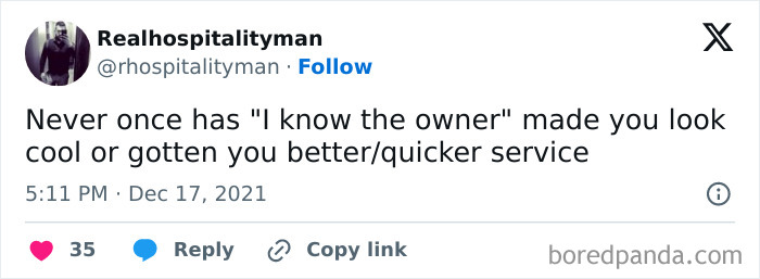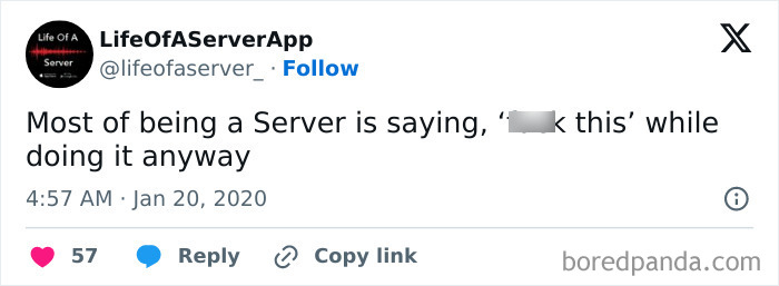 We also asked the founders what servers think is important for customers to understand. “A few of the things I would like customers to realize are that as a server, we do not have any control over food or beverage prices,” they told Bored Panda. “We also have no control over wait times for the food. The more we go into the kitchen and bother (distract) our BOH, the further it sets them behind. (And, pisses them off.) It takes the entire BOH and FOH to operate a restaurant, like a well-oiled machine.”